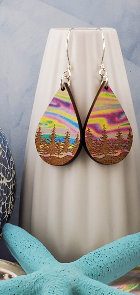 SS Northern Lights Painted Forest Sky - Laser cut Lightweight Wood earrings - Sterling Silver Hooks
