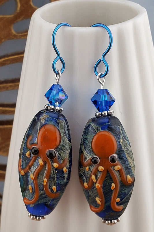 The Kraken Artisan Glass Earrings, Lampwork Glass Bead by a talented artisan, Niobium Earring Wire