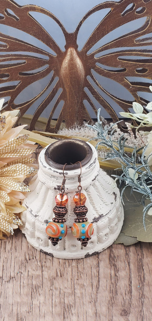 Tropical Swirl Artisan Glass Earrings, Lampwork Glass Bead by Grace Lampwork Beads, Copper Earring Wire