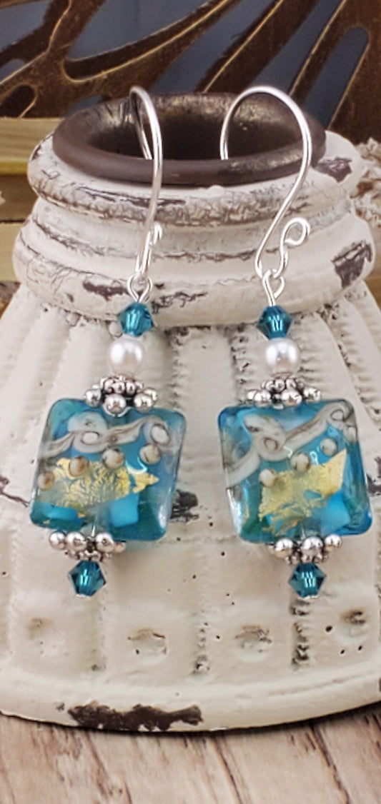Tranquil Oasis Artisan Glass Earrings, Lampwork Glass Bead handcrafted by a talented artisan, Silver Filled Earring Wire