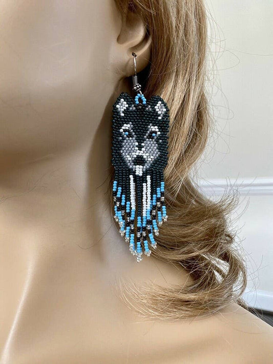 Handmade Beaded Green Blue Wolf Hook Earrings