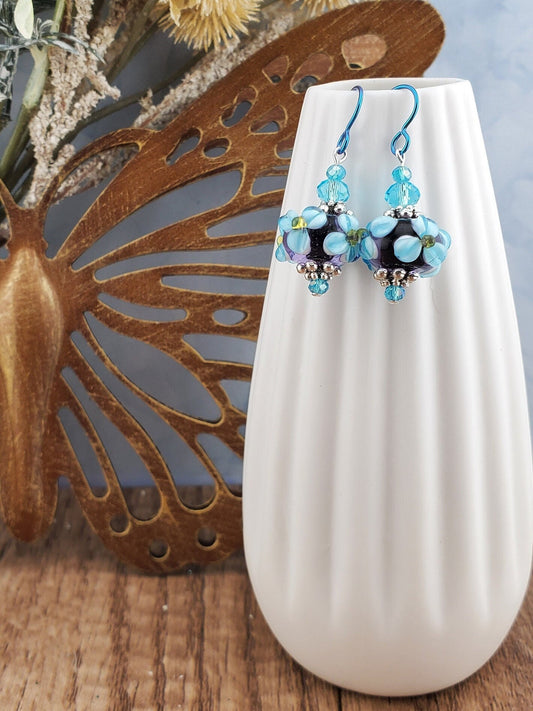 Tropical Bliss Artisan Glass Earrings, Lampwork Glass Bead by a talented artisan, Niobium Earring Wire