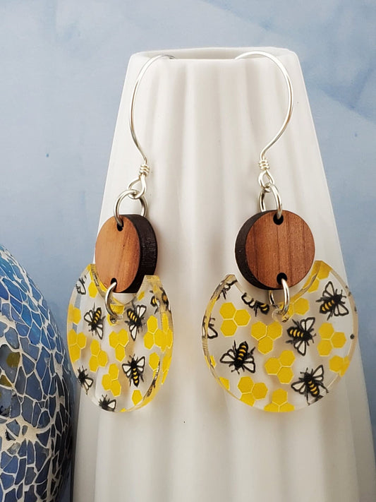 Honey Bee Dangle Earrings - Laser cut Lightweight Wood and Acrylic earrings - Sterling Silver Hooks