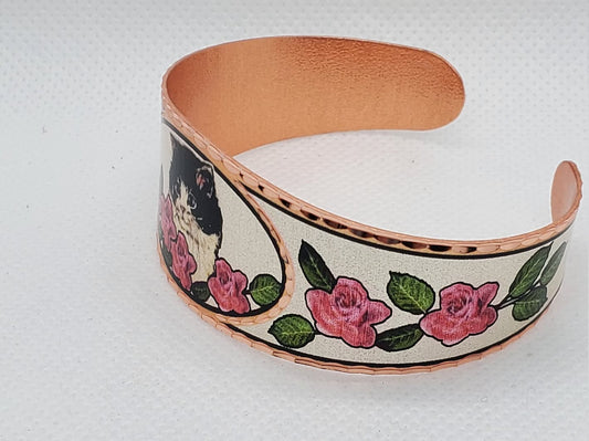 BR - Roses & Cat Bracelet - Beautiful adjustable COPPER cuff bracelet.