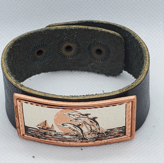 B - Dolphins- Beautiful adjustable COPPER leather bracelet.