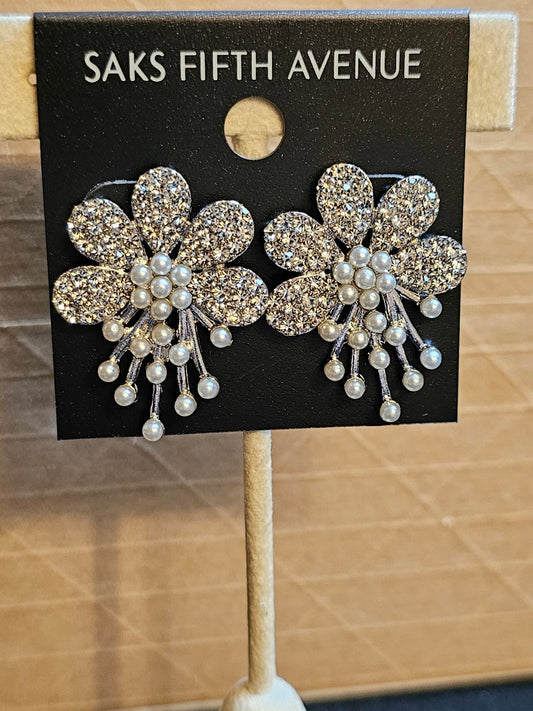 Saks Fifth Avenue Elegant Pearl and Crystal Flower Earrings