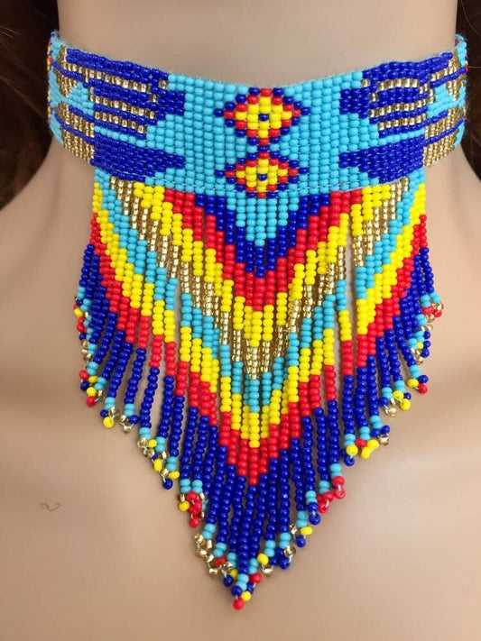Handmade Blue Multi-Color Choker Necklace Earrings Set