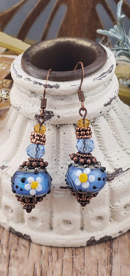 Iridescent Daisy Artisan Glass Earrings, Lampwork Glass Bead by Grace Lampwork Beads, Copper Earring Wire