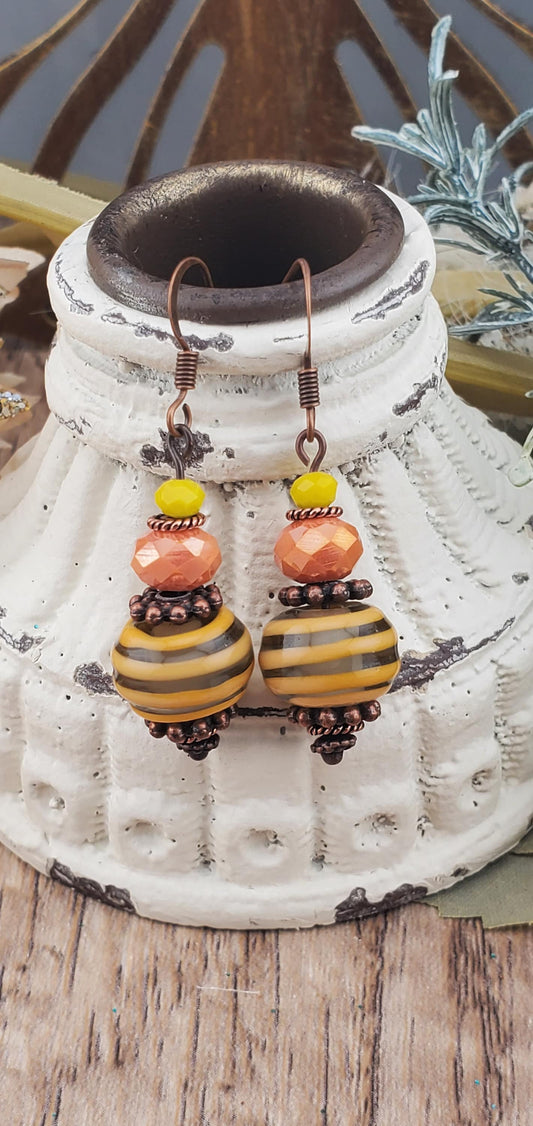 Honey Bee Artisan Glass Earrings, Lampwork Glass Bead by Grace Lampwork Beads, Copper Earring Wire