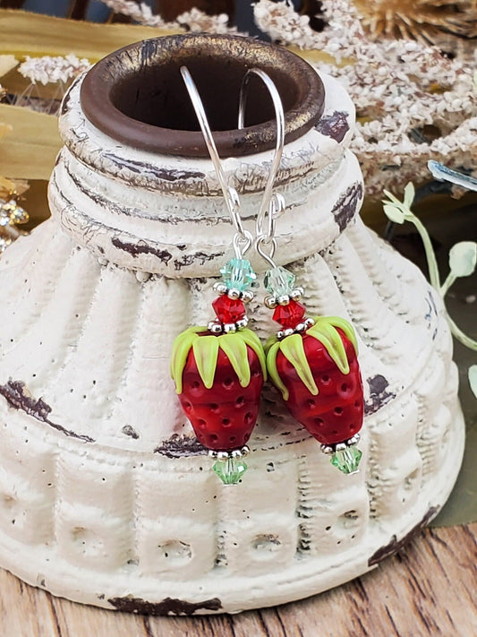 Strawberry Delight Artisan Glass Earrings, Lampwork Glass Bead handcrafted by a talented artisan, Silver Filled Earring Wire