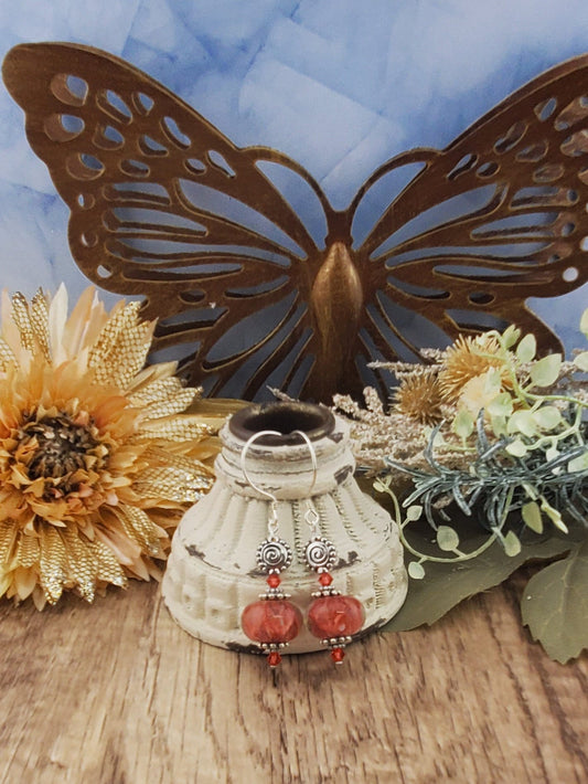 Fiery Red Artisan Glass Earrings, Lampwork Glass Bead handcrafted by a talented artisan, Silver Filled Earring Wire