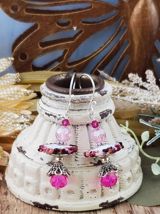 Pink Disk Name Artisan Glass Earrings, Lampwork Glass Bead handcrafted by a talented artisan, Silver Filled Earring Wire