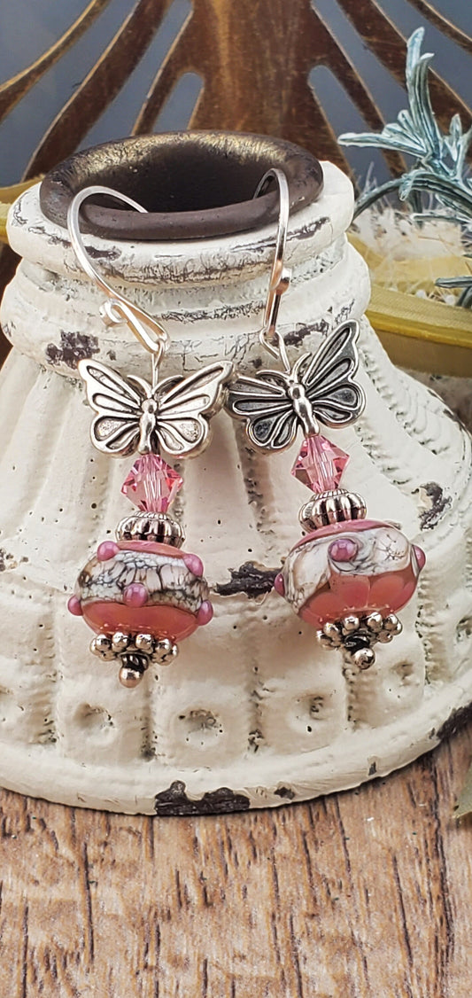 Butterfly Kisses Artisan Glass Earrings, Lampwork Glass Bead by Grace Lampwork Beads, Silver Filled Earring Wire