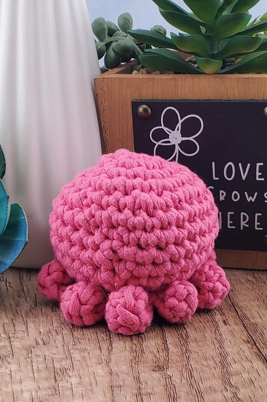 Handcrafted crocheted pink Octopus buddy named Ophelia