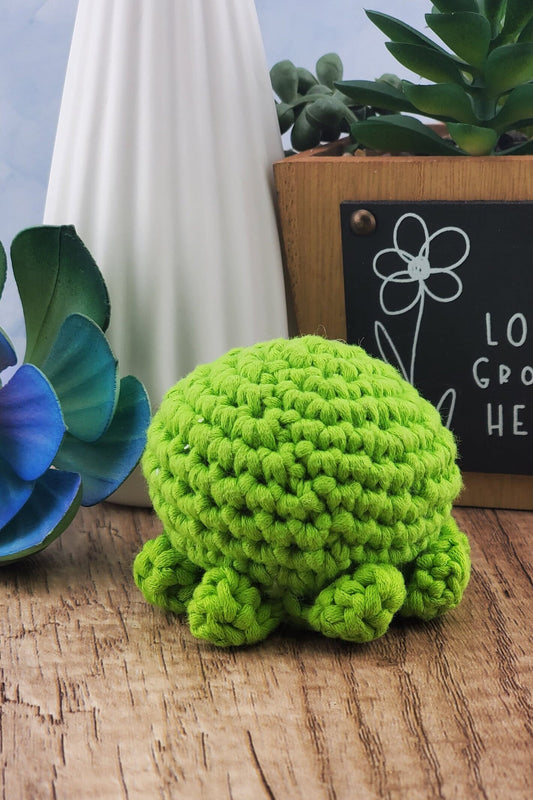 Handcrafted crocheted green Octopus buddy named Oscar.