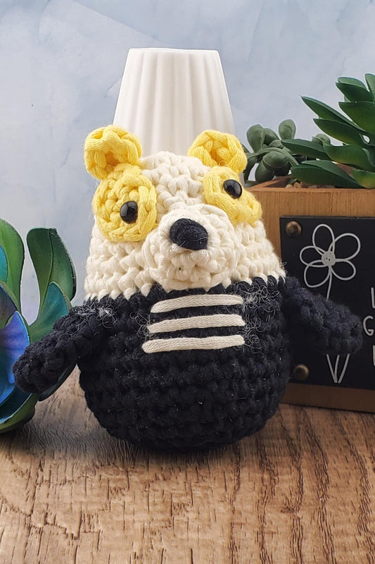 Handcrafted crocheted badger buddy named Hudson. White and black with yellow ears.