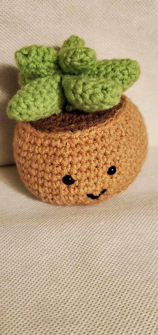 Handcrafted crochet succulent buddy named Aladdin chilling in a brown pot.