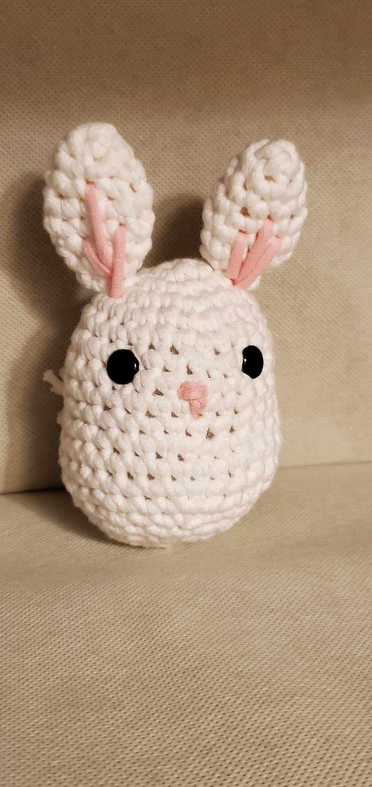 Handcrafted crocheted bunny buddy named Judy. White with pink ears and nose.
