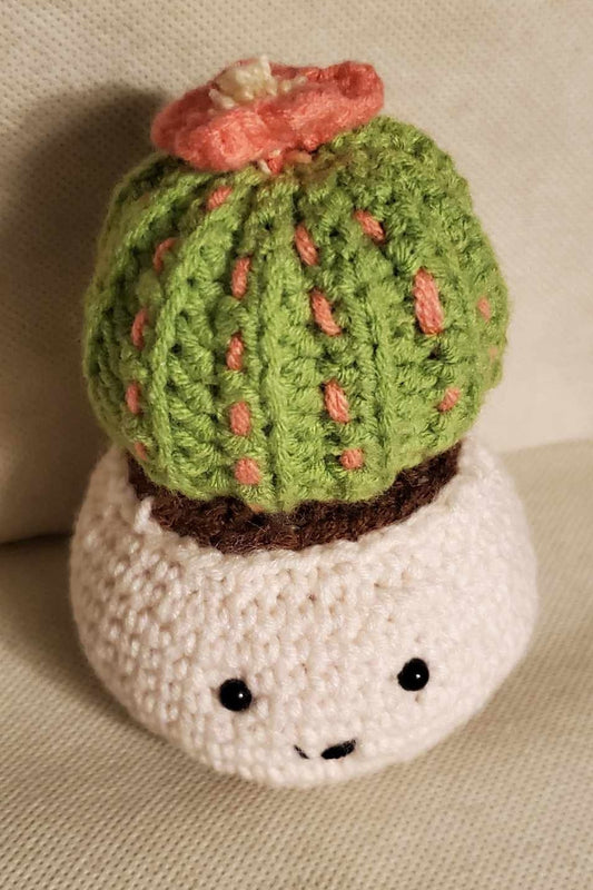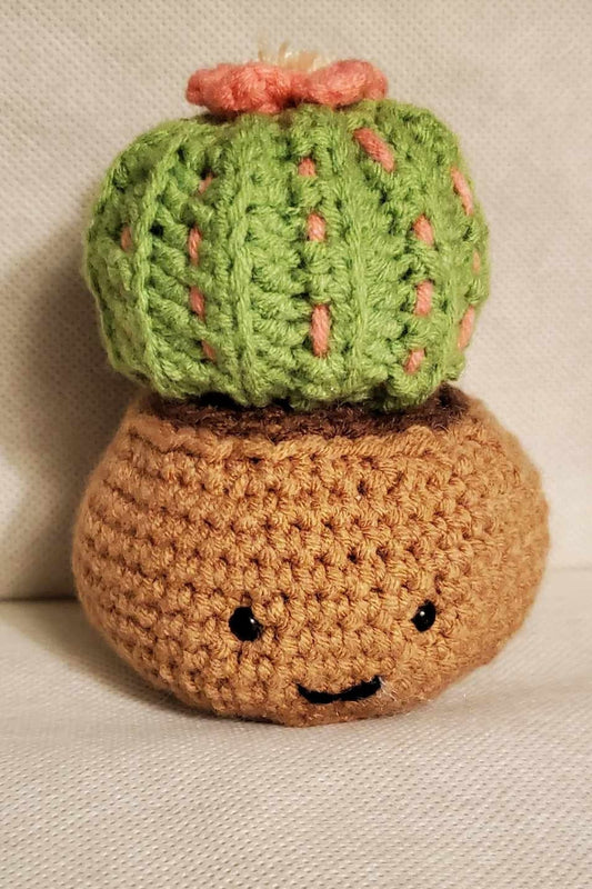 Handcrafted crochet cactus buddy named Gobie chilling in a brown pot, flaunting a sassy pink flower.