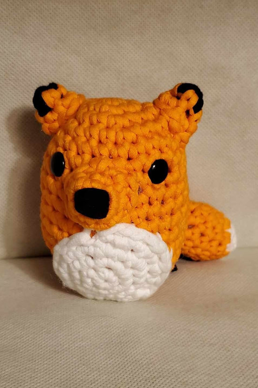 Handcrafted crocheted fox buddy named Copper. Orange and White with black tipped ears.