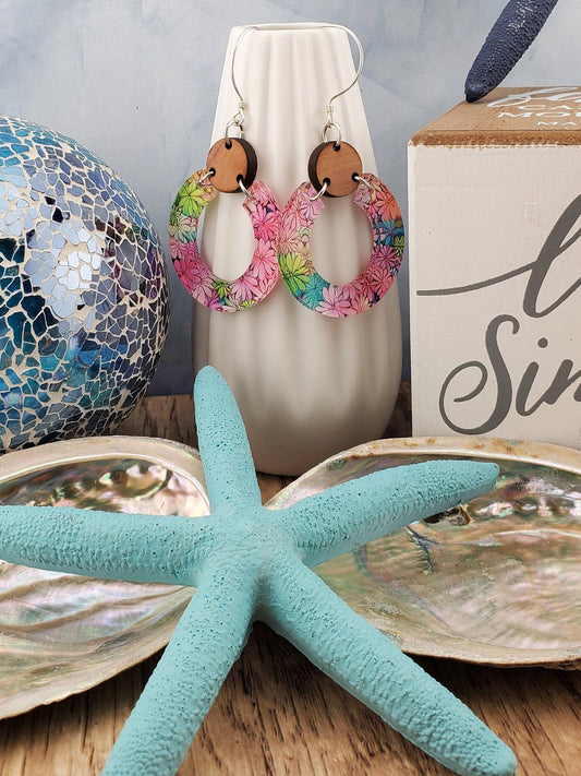 Colorful Flowers Dangle Earrings - Laser cut Lightweight Wood and Acrylic earrings - Sterling Silver Hooks