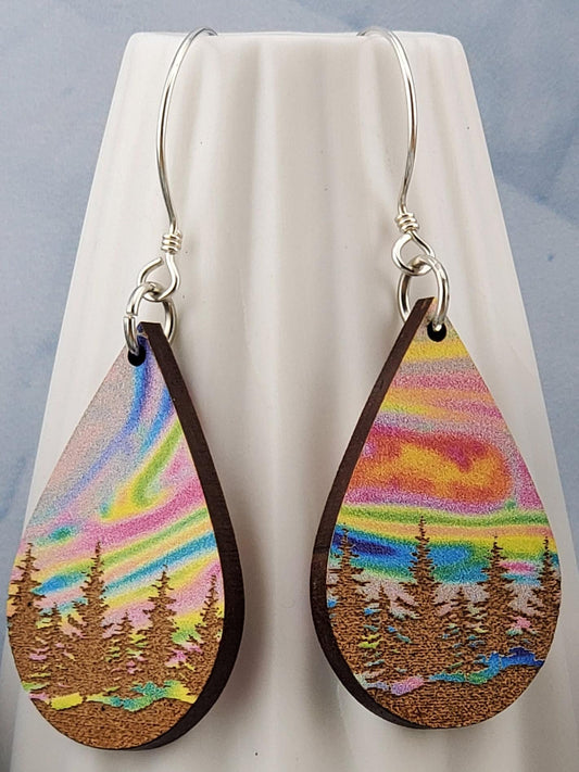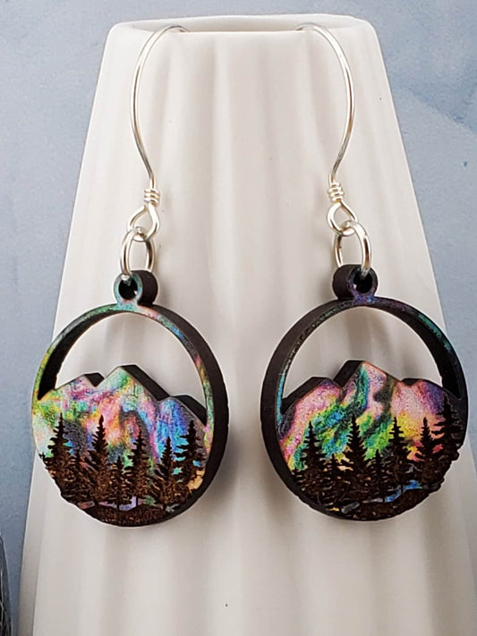 SS Northern Lights over Mountains and Forest - Laser cut Lightweight Wood earrings - Sterling Silver Hooks