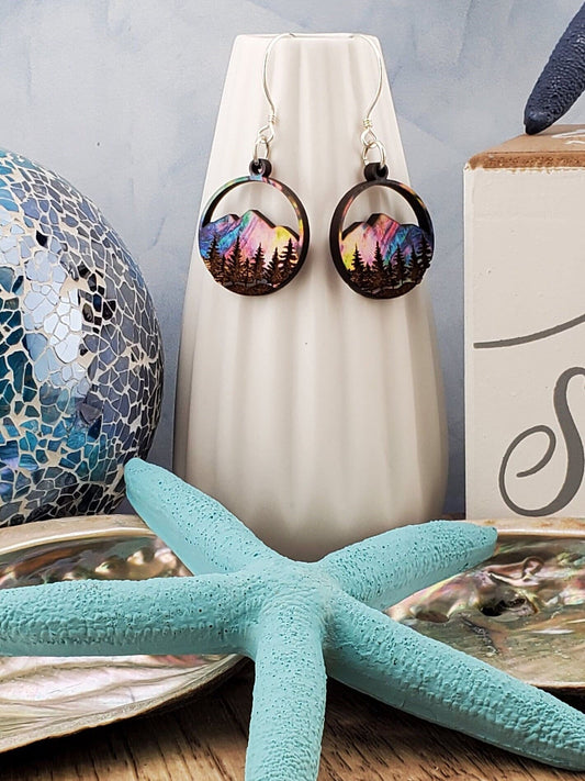 Northern Lights Mountains and Forest Sky - Laser cut Lightweight Wood earrings - Sterling Silver Hooks