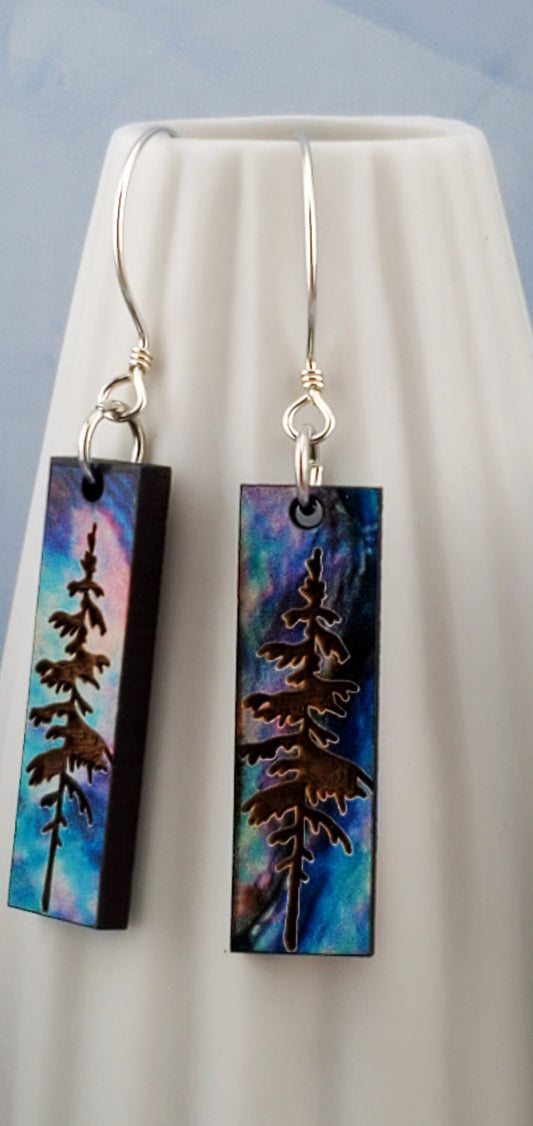 Northern Lights Forest Sky - Laser cut Lightweight Wood earrings - Sterling Silver Hooks