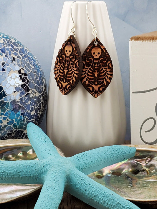 Day of the Dead Skull earrings - Laser cut Lightweight Wood earrings - Sterling Silver Hooks