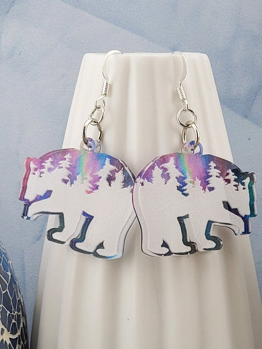 Northern Light Treeline Polar Bear earrings - Laser cut Lightweight Acrylic earrings - Silver Plated Hooks