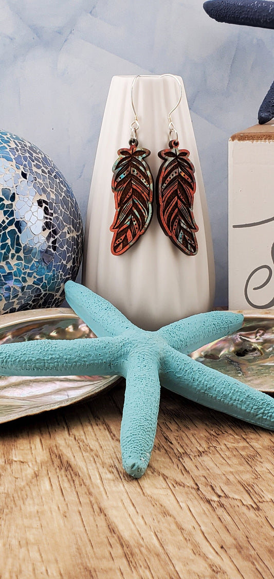 Fall Feather - Laser cut Lightweight Wood earrings - Sterling Silver Hooks