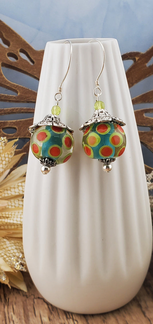 SF Dot & Dazzle Artisan Glass Earrings, Lampwork Glass Bead handcrafted by a talented artisan, Silver Filled Earring Wire