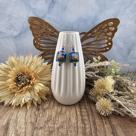 SF Blooming Tranquility Artisan Glass Earrings, Lampwork Glass Bead handcrafted by a talented artisan, Silver Filled Earring Wire