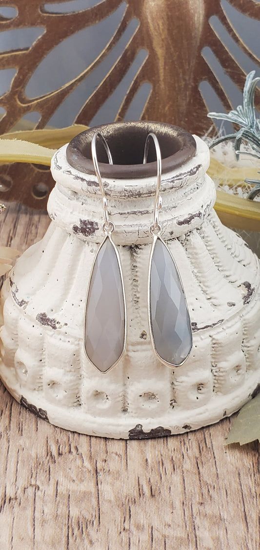 Grey Moonstone 10x32mm Earrings, Silver Filled Earring Wire