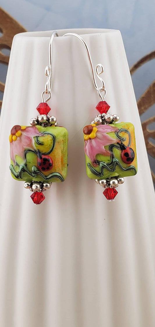 SF Ladybug Blossoms Artisan Glass Earrings, Lampwork Glass Bead handcrafted by a talented artisan, Silver Filled Earring Wire