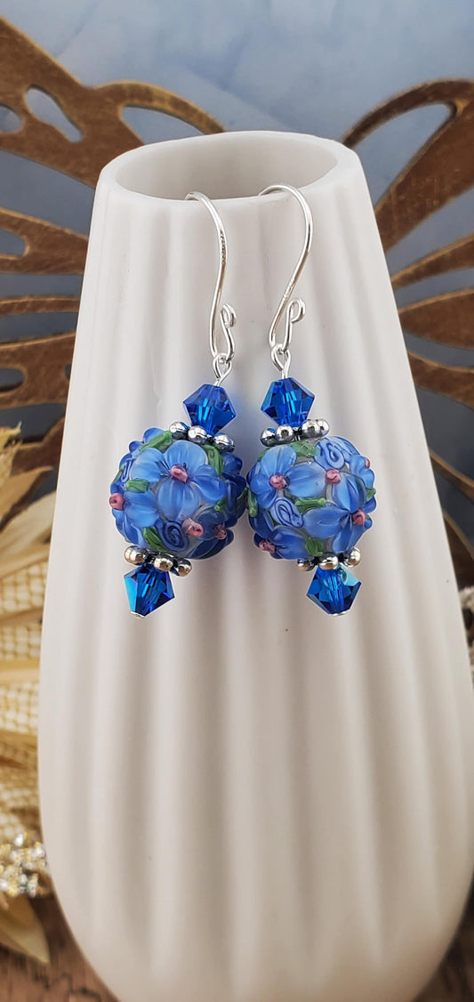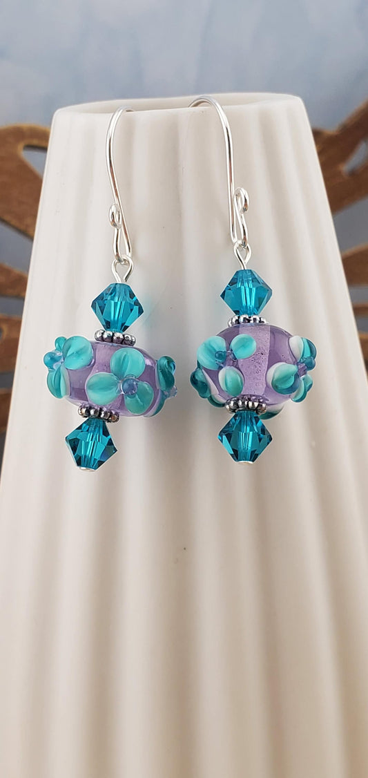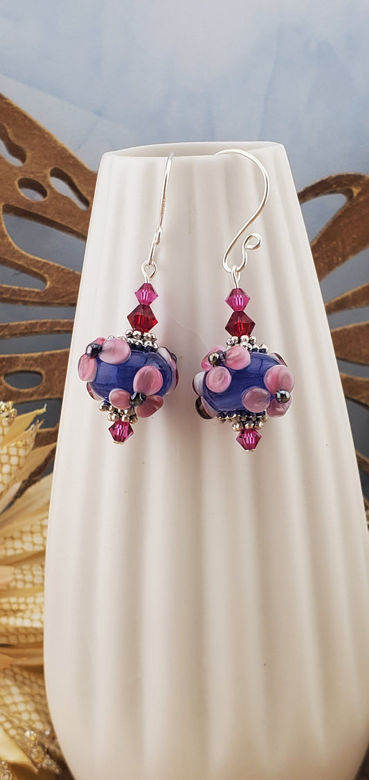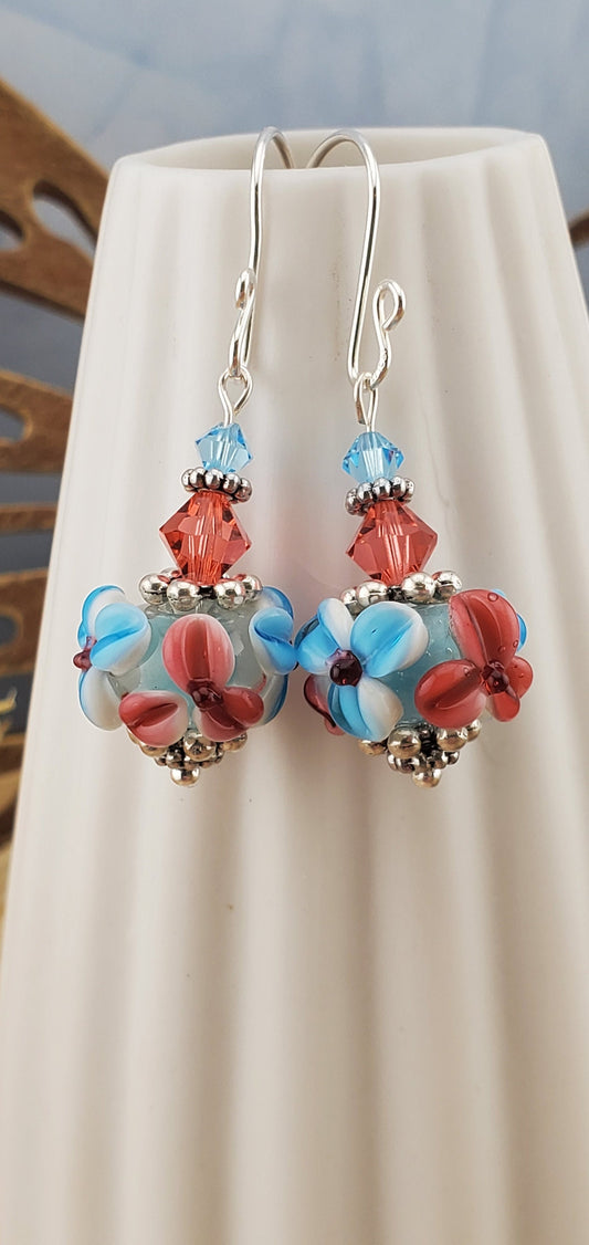 SF Floral Fantasia Artisan Glass Earrings, Lampwork Glass Bead by a talented artisan, Silver Filled Earring Wire