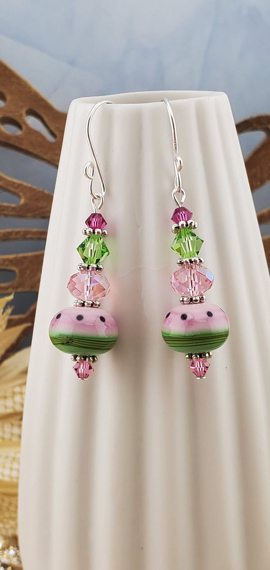 SF Watermelon Bliss Artisan Glass Earrings, Lampwork Glass Bead handcrafted by a talented artisan, Silver Filled Earring Wire