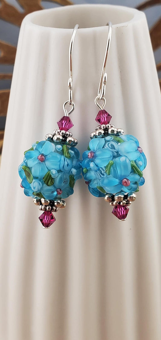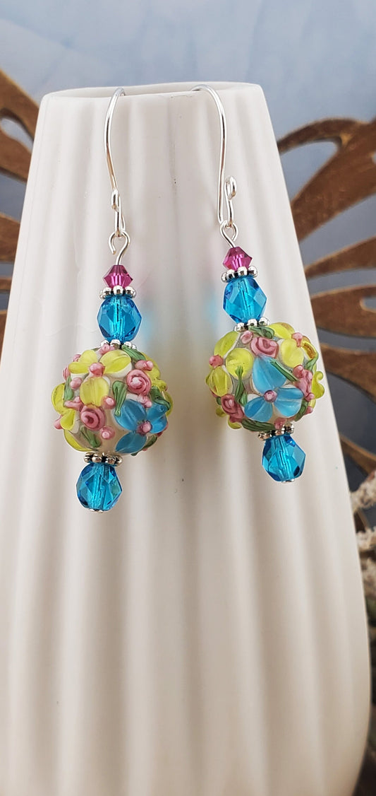 SF Blooming Beauties Artisan Glass Earrings, Lampwork Glass Bead handcrafted by a talented artisan, Silver Filled Earring Wire