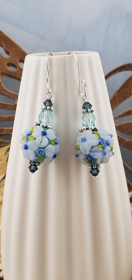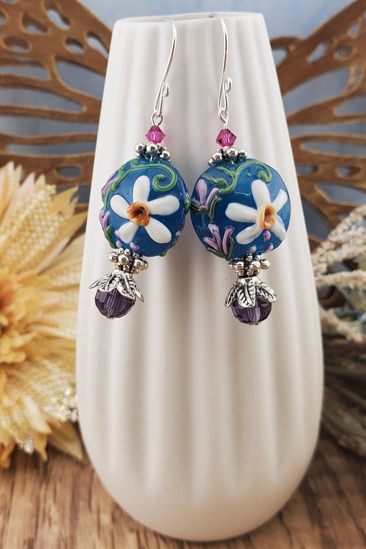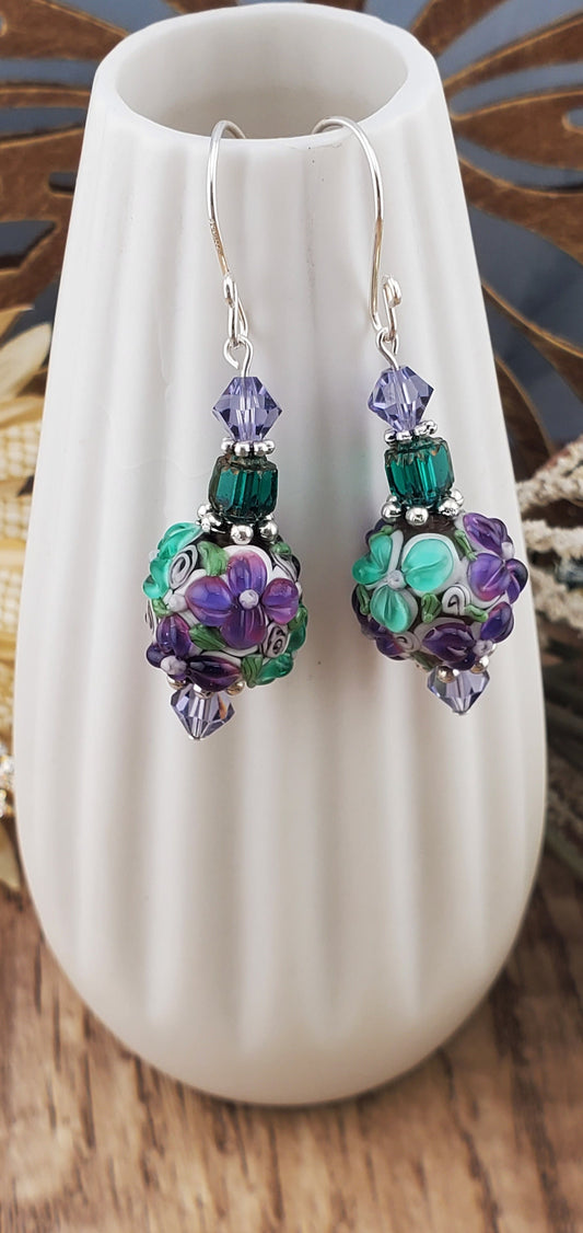 SF Floral Fantasy Artisan Glass Earrings, Lampwork Glass Bead handcrafted by a talented artisan, Silver Filled Earring Wire
