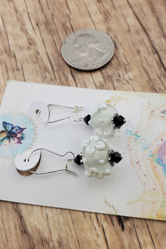 SF Snow Petal Sparkle Artisan Glass Earrings, Lampwork Glass Bead handcrafted by a talented artisan, Silver Filled Earring Wire