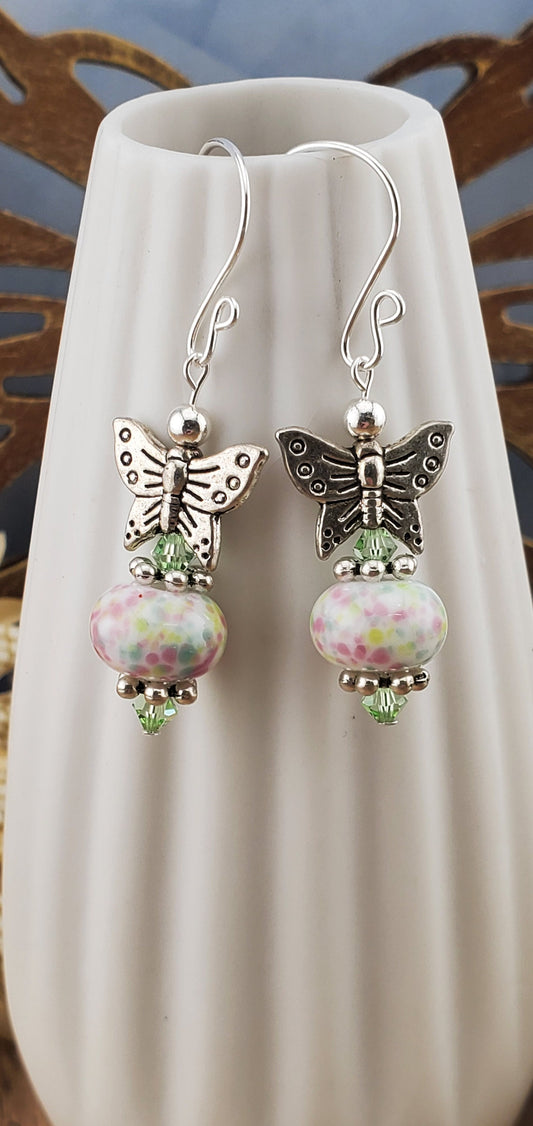 SF Fluttering Spring Confetti Artisan Glass Earrings, Lampwork Glass Bead handcrafted by a talented artisan, Silver Filled Earring Wire