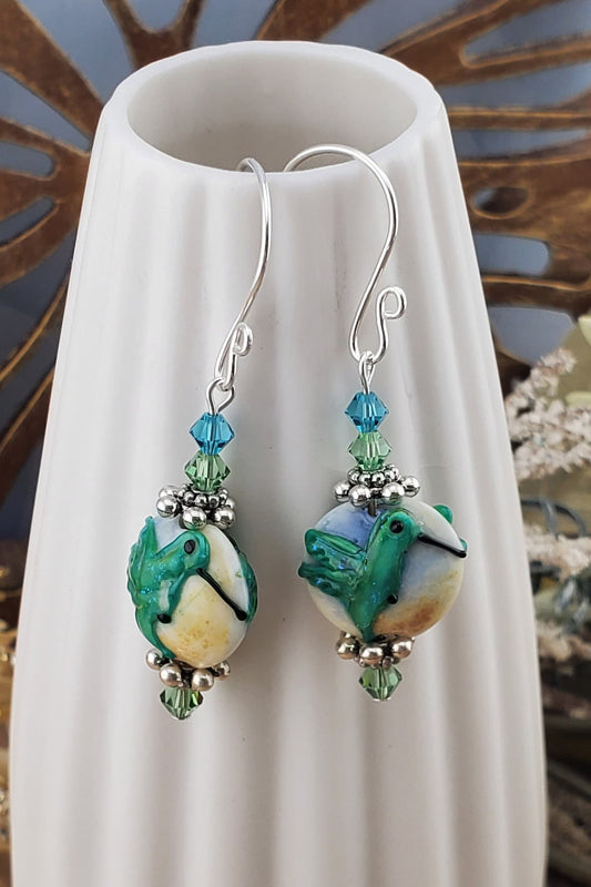 SF Hummingbird in Flight Artisan Glass Earrings, Lampwork Glass Bead handcrafted by a talented artisan, Silver Filled Earring Wire