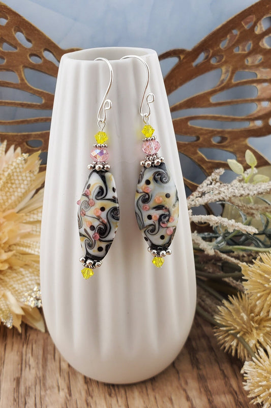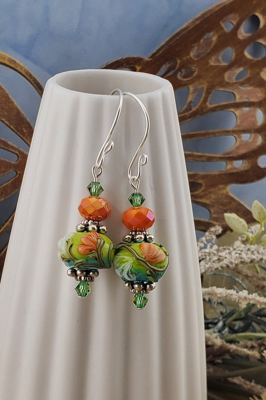SF Citrus Blossom Glow Artisan Glass Earrings, Lampwork Glass Bead handcrafted by a talented artisan, Silver Filled Earring Wire