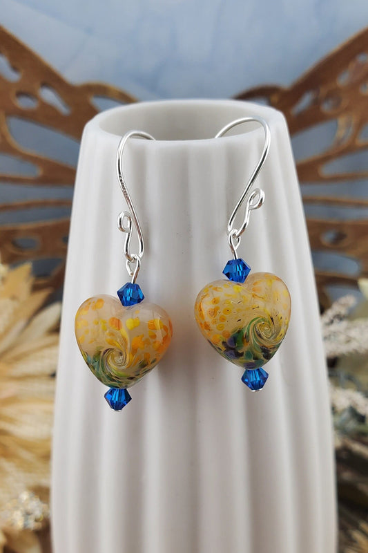 SF Golden Serenade Heart Artisan Glass Earrings, Lampwork Glass Bead handcrafted by a talented artisan, Silver Filled Earring Wire