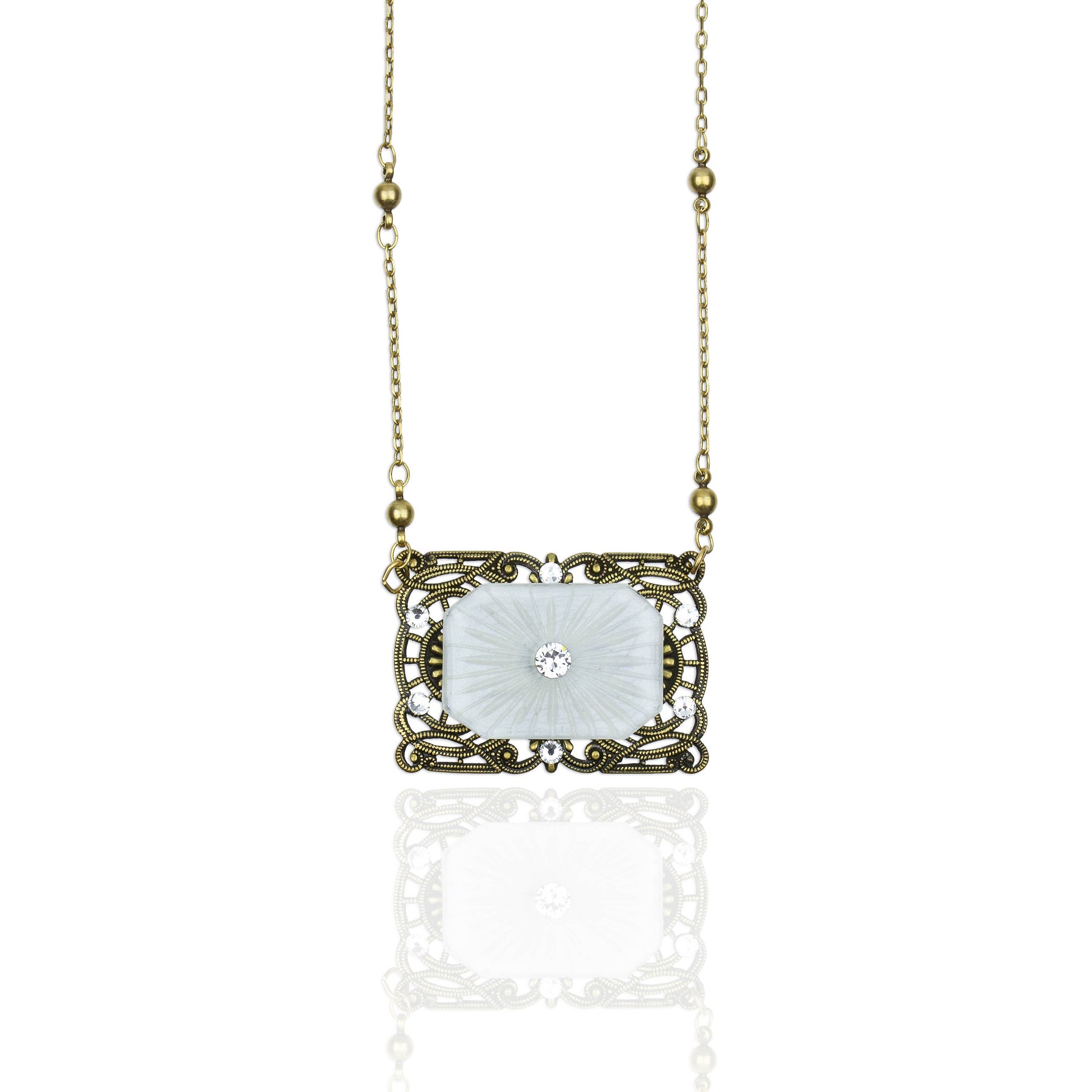 Made in the USA with lead/nickel free antiqued brass findings and antiqued brass chain. Lobster claw closure.
