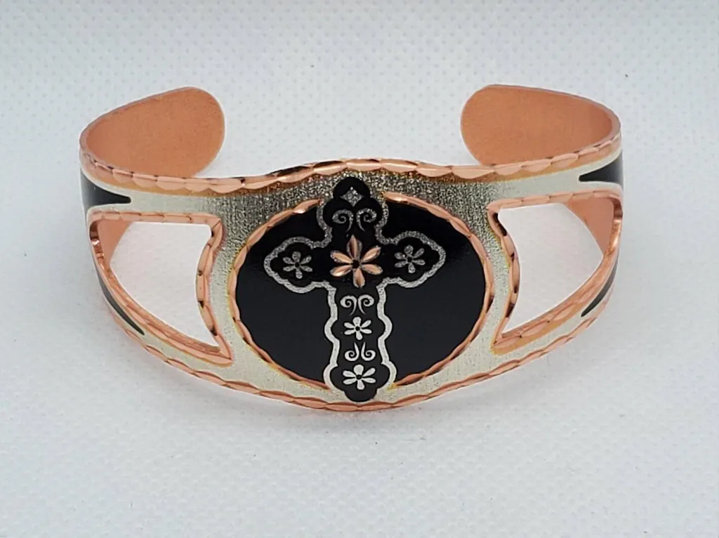 B - Flower Cross Bracelet - Beautiful adjustable COPPER cuff bracelet. Religious Jewelry.