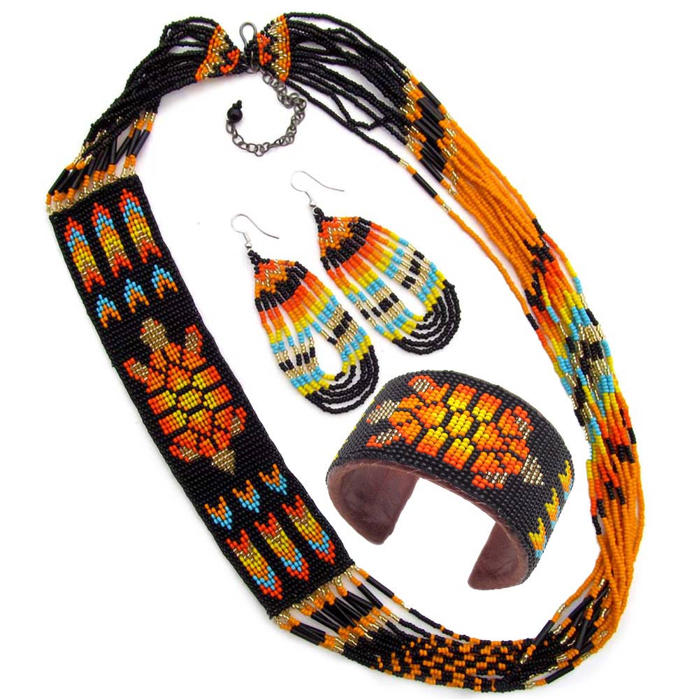 The set is native style handmade using Czech beads Colors: Black and Orange The set includes a necklace earrings and a matching bracelet in Turtle design Necklace Length: 16-18 inch Earrings: about 3 inch Bracelet woven part is 6.5 inch. It is bendable.