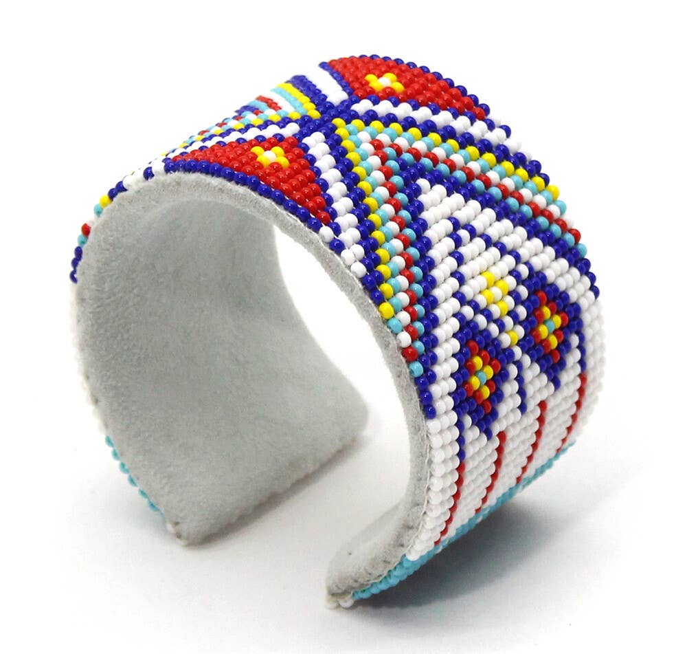 White Red Blue handmade beaded adjustable cuff made with Czech size 11/0 beads Back part of Bracelet covered with Natural Soft Leather 2.0 Inch Diameter, Length of Beaded Part Is 6.5 Inch. Inside length of Bracelet is 6 Inch Width: 1.5 inch MATCHING SET NO. IS S-54-SB-3 B-58-SB-31