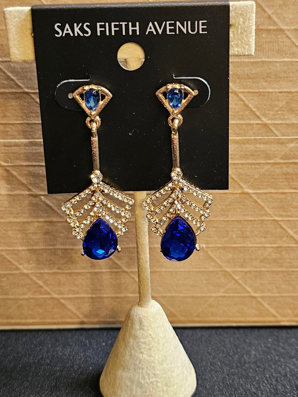 Add a touch of glamour to your jewelry collection with these stunning earrings from Saks Fifth Avenue. Featuring a captivating design with rich blue teardrop stones surrounded by sparkling rhinestones, these earrings are perfect for both casual and formal occasions. The intricate gold-tone settings enhance their elegance, making them a standout accessory. - High-quality materials - Eye-catching blue and gold colors - Perfect for special events or everyday wear - Lightweight and comfortable to wear - Comes with original packaging for gifting or storage.