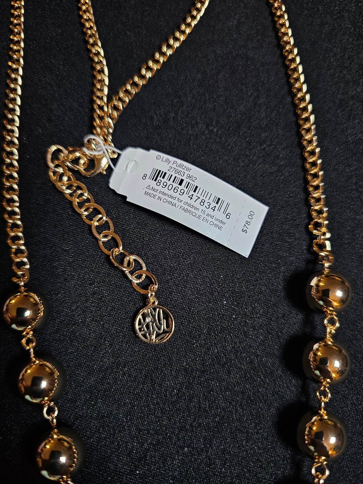Elevate your jewelry collection with this stunning Lilly Pulitzer Floral Statement Necklace. Featuring an intricate design with delicate flower accents and a touch of elegance from the gold-toned chain. Perfect for adding a feminine flair to any outfit. - Beautiful floral designs with pearl-like details - Gold-toned chain for a luxe finish - Versatile for day or evening wear - Adjustable length for a comfortable fit - Lightweight design ensures all-day wear.